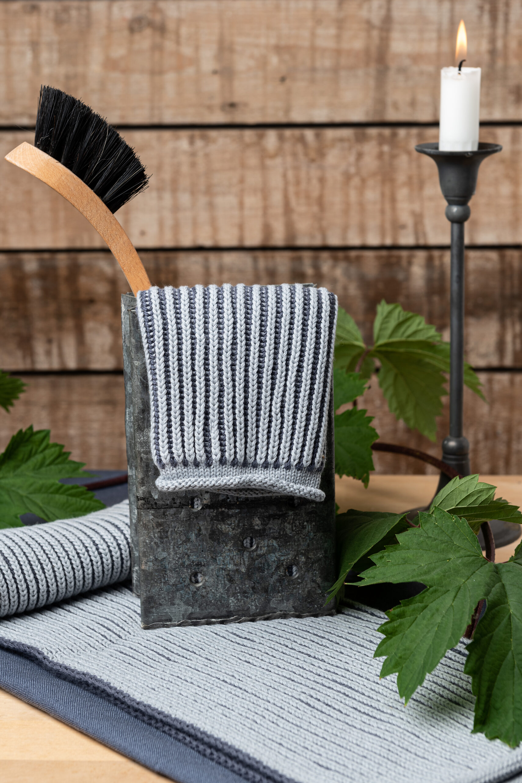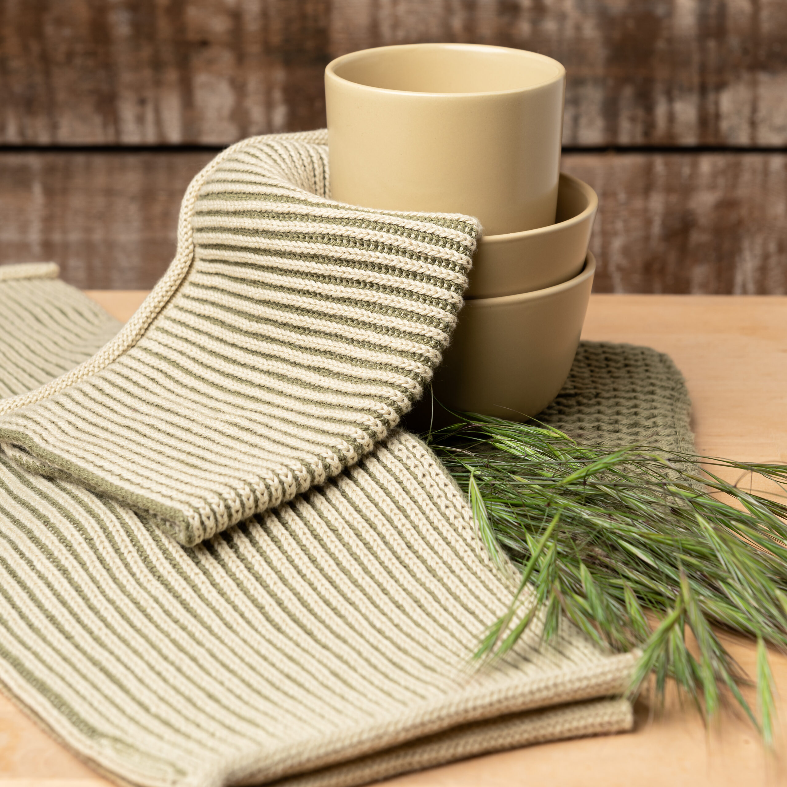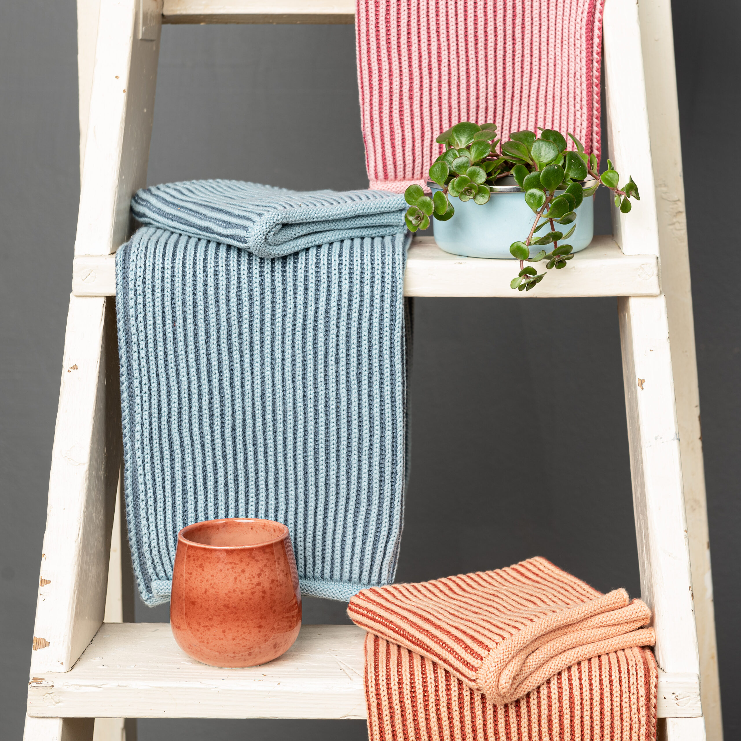 Lovely rib knitted series in two beautiful tone in tone colors consisting of a cloth (25 x 25 cm) and a towel (32 x 47 cm) made of 100% organic cotton.