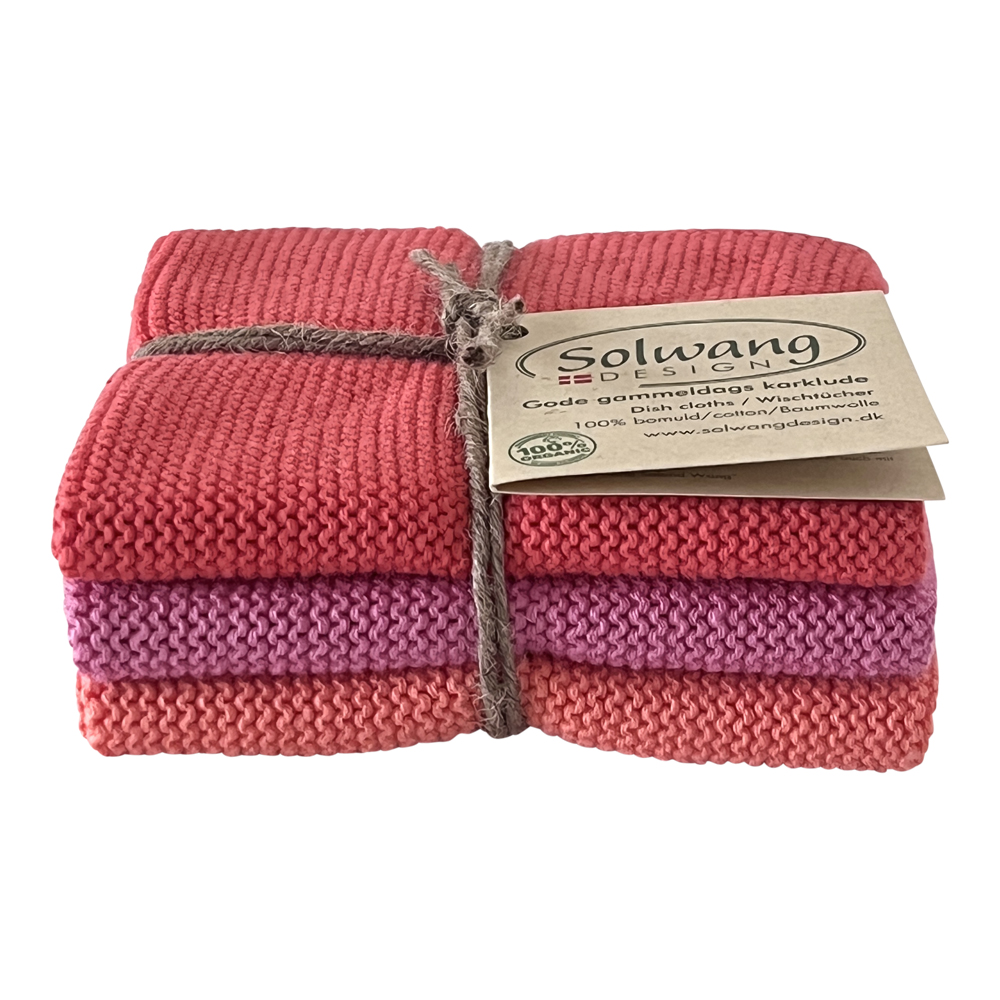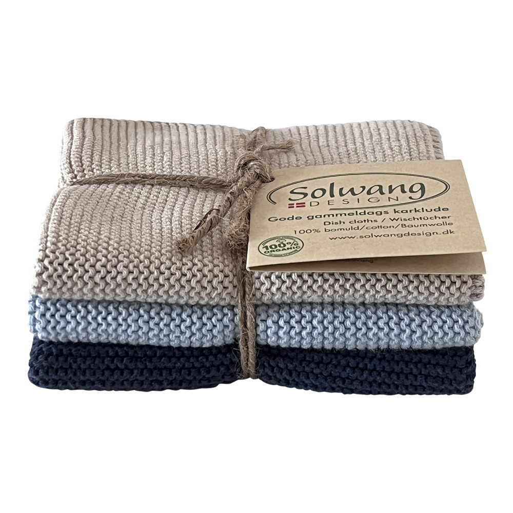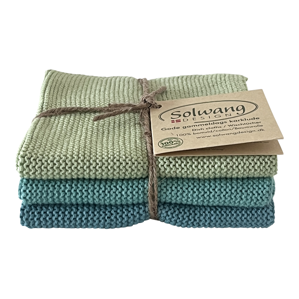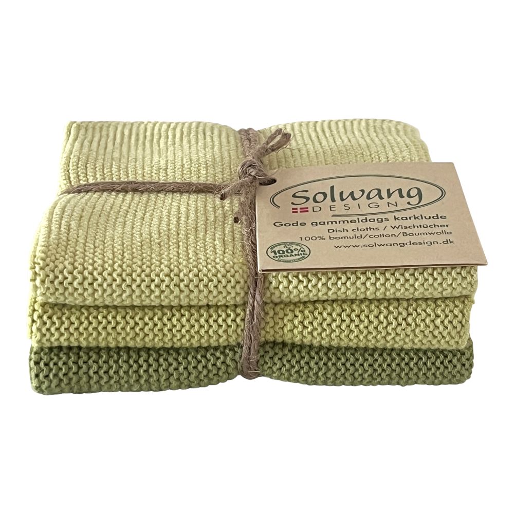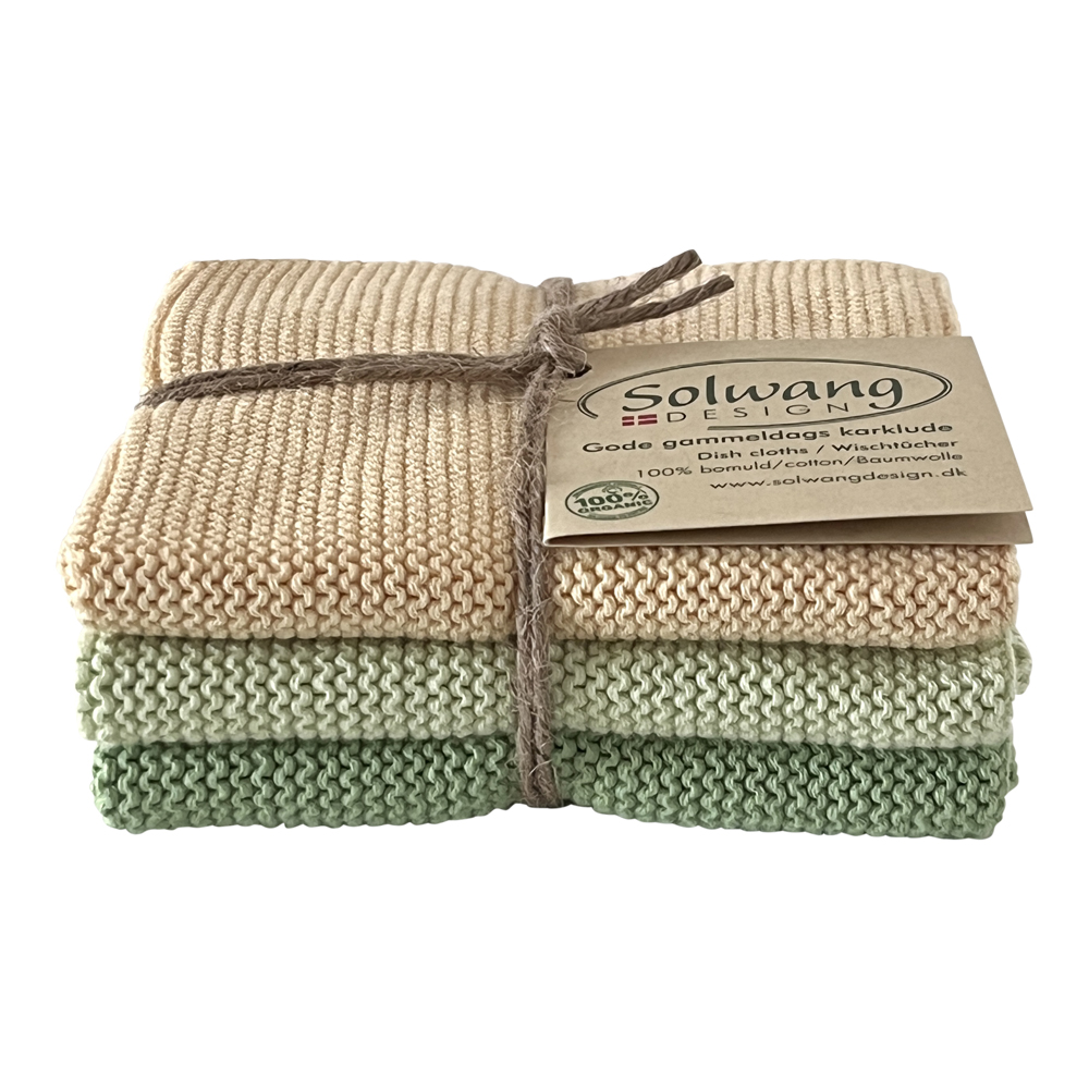 3 stk. strikkede karklude i oliven og abrikos.