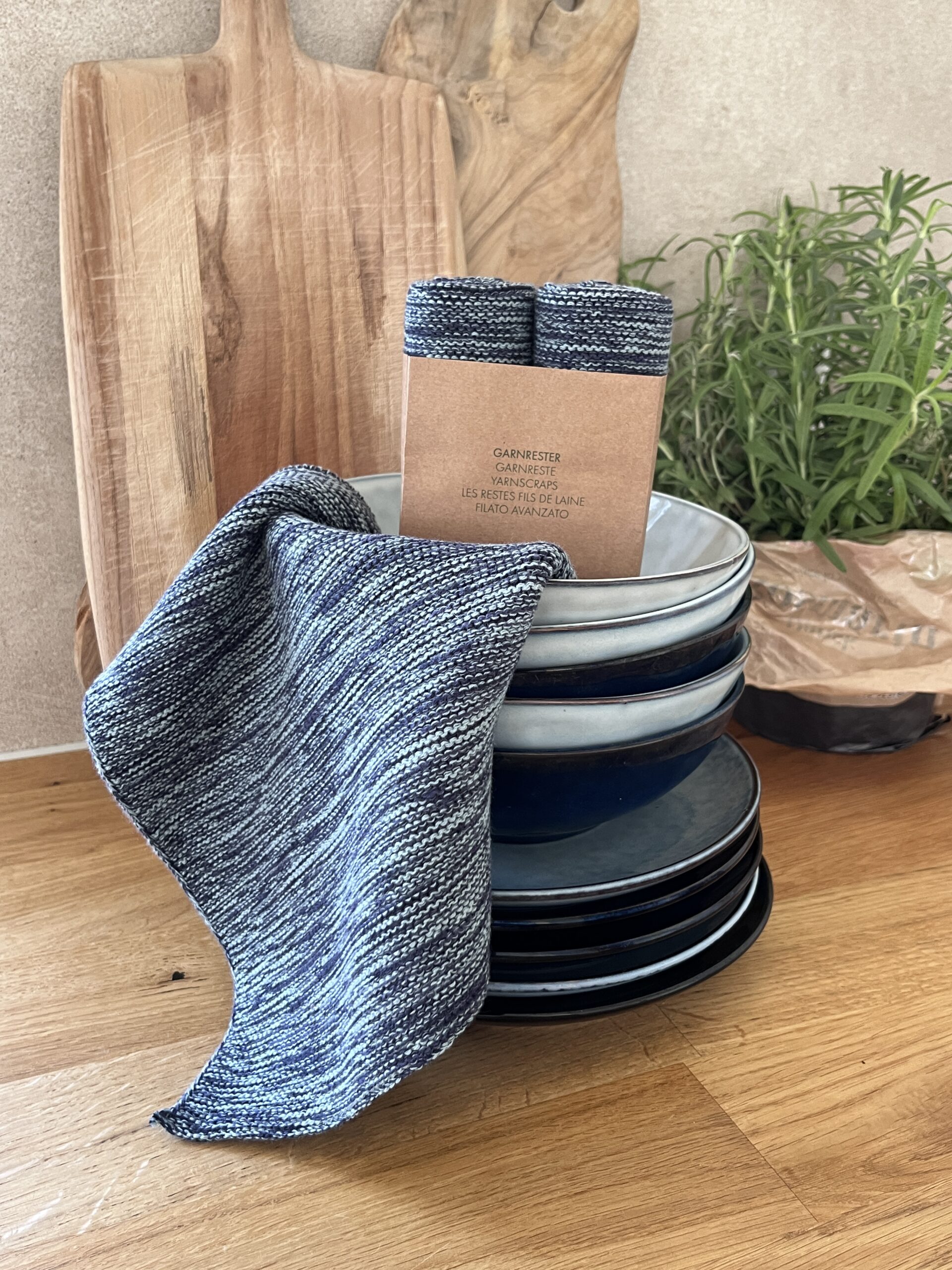 2-pak multikulørte karklude lavet i restegarn i Oeko-tex kvalitet, pakket i en lille papirspose.