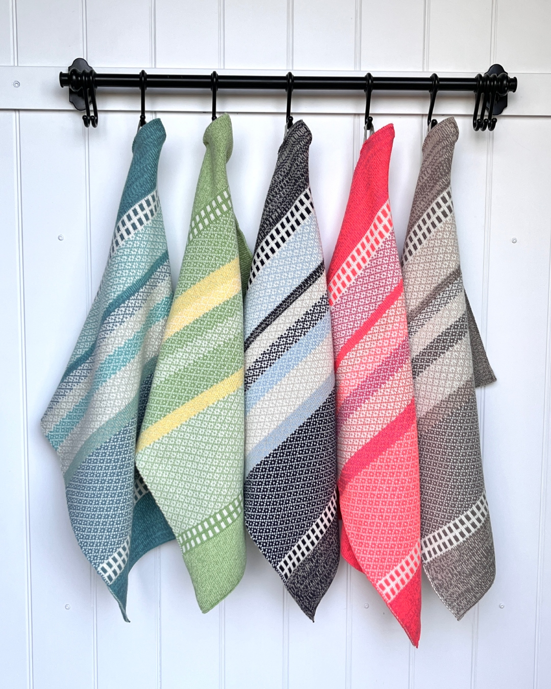 Hvert håndklæde er unikt, da farvekombinationerne af de anvendte garnrester varierer.